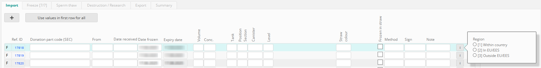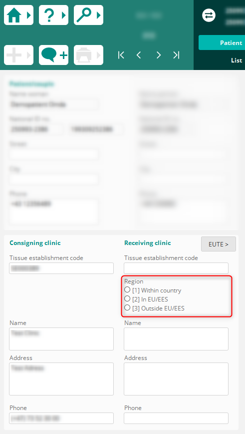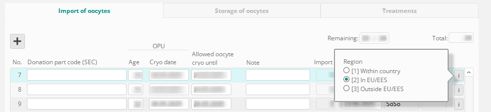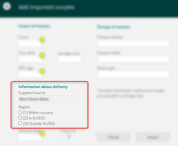 When importing tissue (via the Patient component > page "Tissue" or page "Embryo"; via the external donor component), you will be able to register additional information about the region from which the tissue is imported. This is a datapoint for national registries.